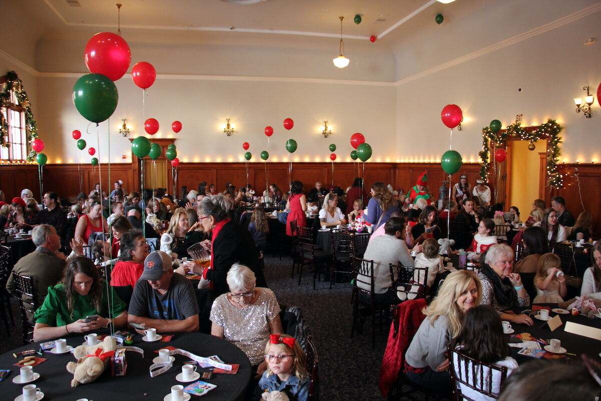 Built over 100 years ago, the Park Ballroom allows its guests to step back in time. Tables were set up throughout the room, with Moye on the stage, choreographing the day. Moye would like to thank Denny, Brent, and Ashley for lending the ballroom as the venue. It took about 15 volunteers — dressed in their Christmas Elf best — to run the tea. Cookies were ready on the tables with a customized tea set for each little guest.