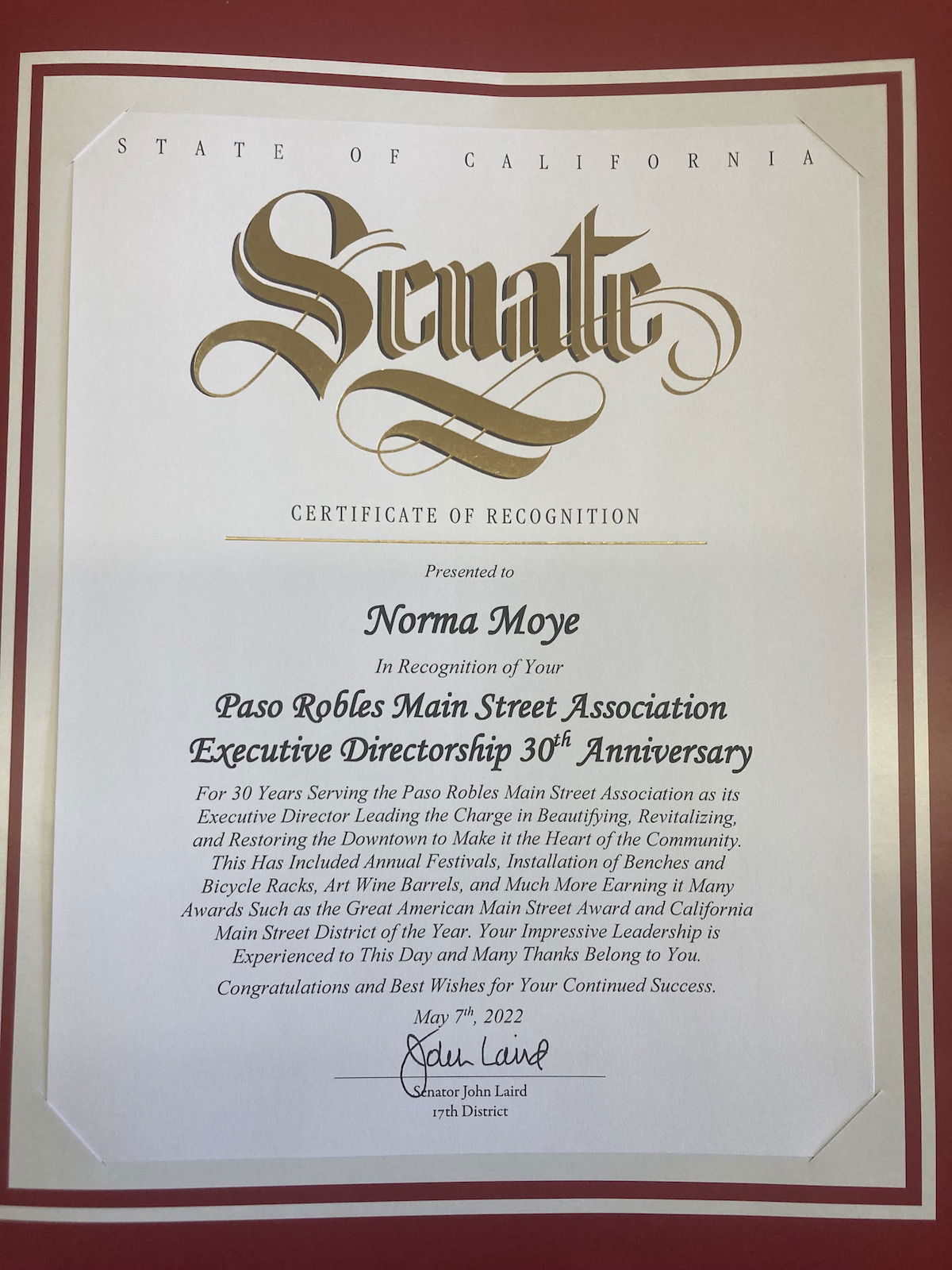 Senator Laird awarded Moye with a certificate of recognition which read, "In recognition of your Paso Robles Main Street Association Executive Directorship 30th Anniversary. For 30 years serving the Paso Robles Main Street Association as its Executive Director leading the charge in Beautifying, Revitalizing, and Restoring the Downtown to make it the heart of the community. This has included annual festivals, installation of benches and bicycle racks, art wine barrels, and much more, earning it many awards such as the Great American Main Street Award and California Main Street District of the Year. Your Impressive Leadership is experience to this day, and many thanks belong to you. Congratulations and Best Wishes for your continued success."