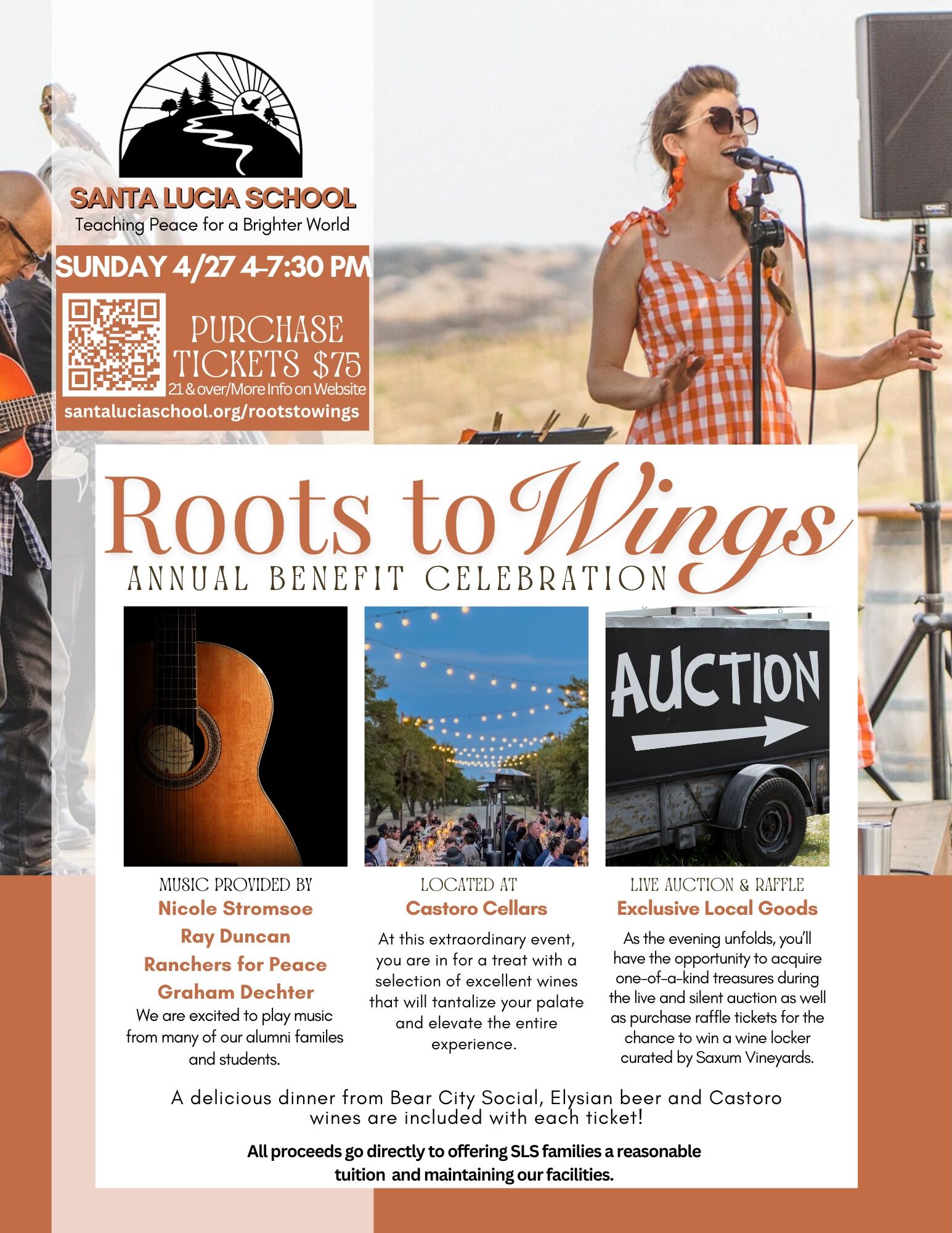 TEMPLETON — Santa Lucia School, a holistic K–8 institution in Templeton, will host its annual "Roots to Wings" benefit celebration on Sunday, April 27, from 4 to 7:30 p.m. at Castoro Cellars. The 21+ event will feature live music by Nicole Stromsoe, Ray Duncan, Ranchers for Peace, and Graham Dechter — highlighting alumni and student talent. Guests will enjoy a delicious dinner from Bear City Social, beer from Elysian, and wines from Castoro Cellars, all included with a $75 ticket.
