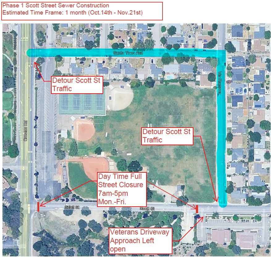 PASO ROBLES — Scott Street will be closed to all traffic from Creston Road to Via Ramona beginning Monday, October 14, through Thursday, November 21, from 7 a.m. to 5 p.m., Monday through Friday.